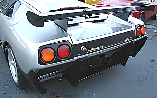 Die gewaltigen Heckdiffusoren geben den Blick frei auf die veränderte Auspuff- anlage. Normalerweise sitzt hier eine mächtige Vier-Strahl-Anlage, deren Endrohre jeweils unter den Rücklichtern paarweise zum Vorschein kommen.