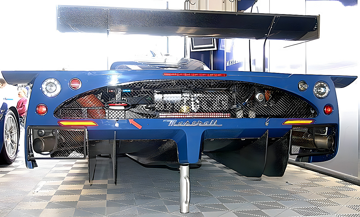 Beim Blick von hinten unter den aufgebockten GT-Rennwagen,