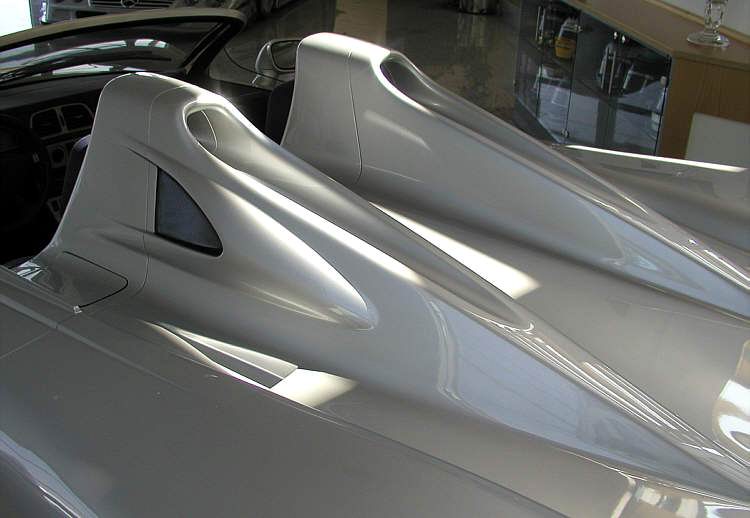 Damit der V12-Motor genug Frischluft bekommt, wurden die Überrollbügel entsprechend modelliert und bekamen an den Außenseiten Ansaugstutzen.