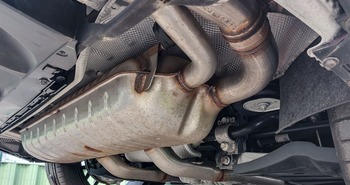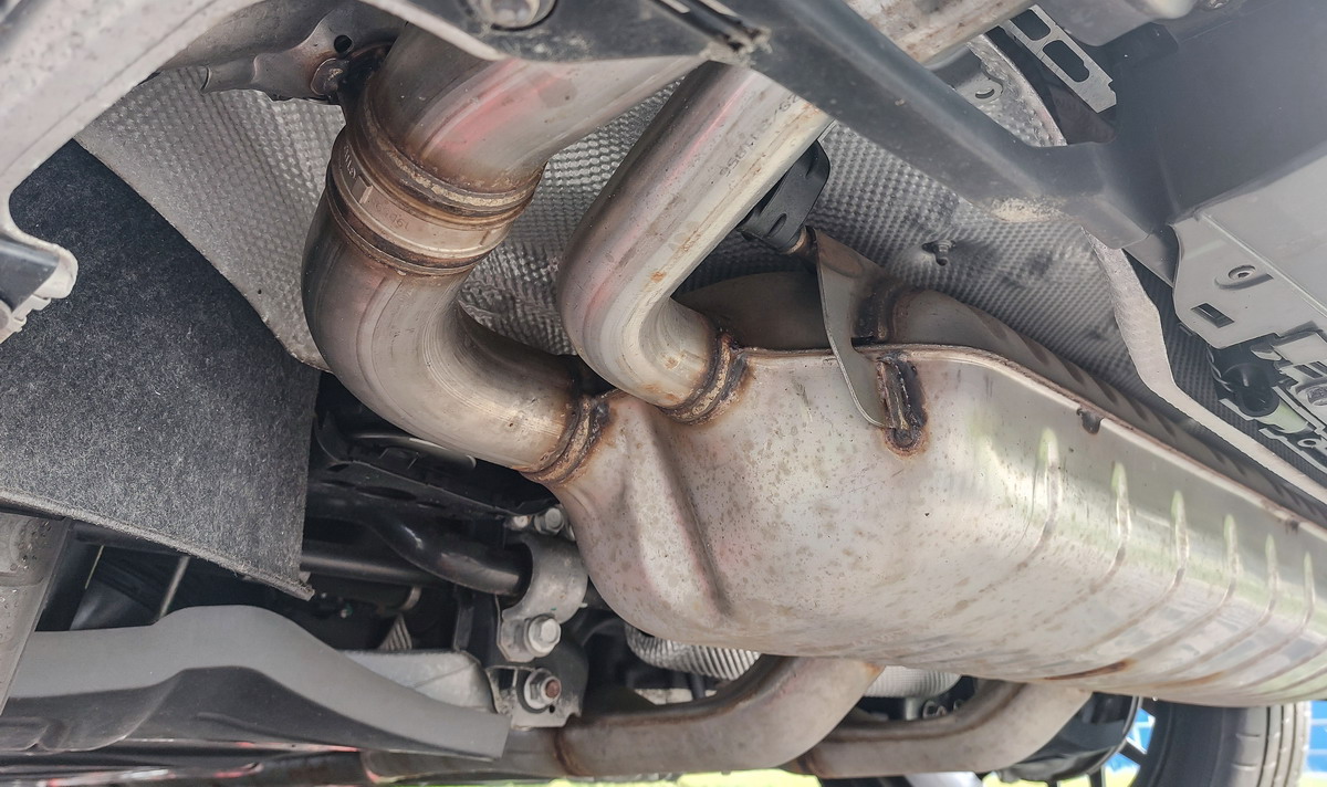 Der Blick auf den Endtopf und die letzten vier Enden zeigt unterschiedlichen Durchmesser des finalen Abgasstrangs.