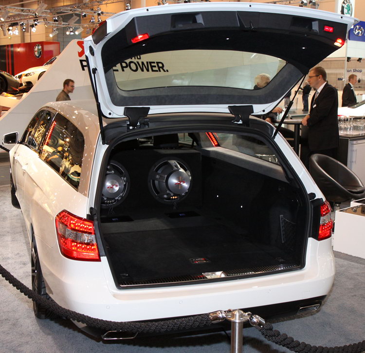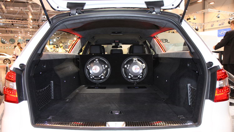 Selbst riesige Subwoofer verschwinden klein und unauffällig an der Lehne der Rücksitze.
