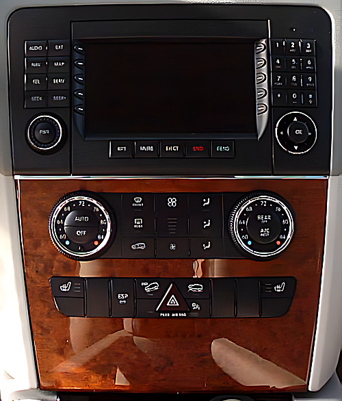 In der Mittelkonsole ist neben der Klima- regulierung und der Audio-, Navi- und Telefonzentrale noch eine Schalterreihe zu finden. Hier können neben den Sitz- heizungen auch die verschiedenen Fahr- hilfen für Böschungsfahrt und ESP zu- und abgeschaltet werden.