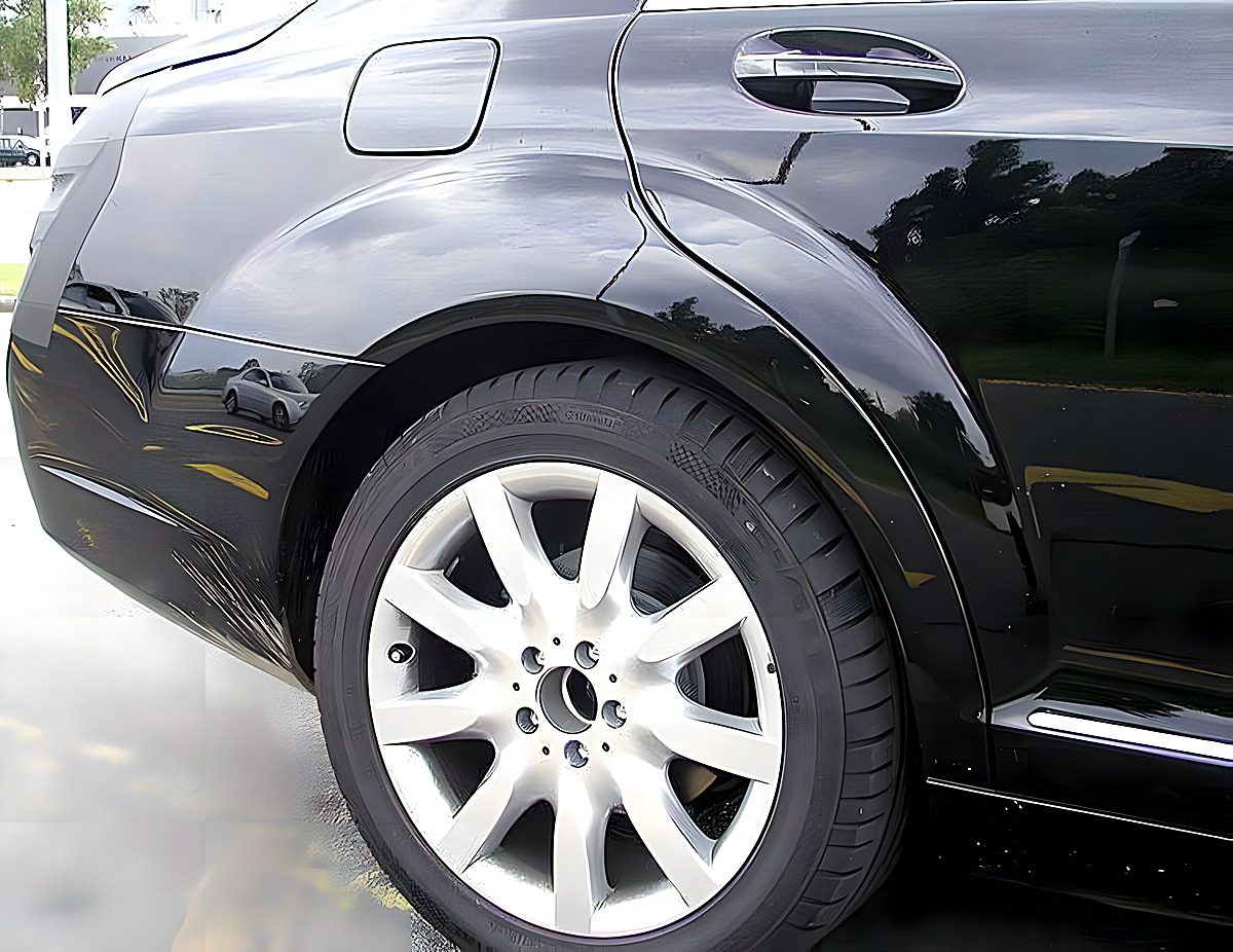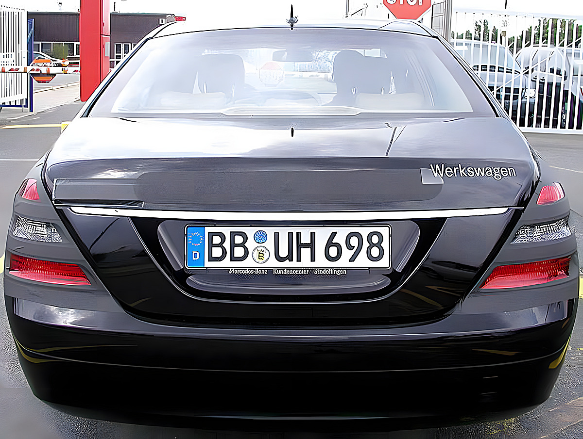 Hier sind am Heck das Typenschild, Mercedes-Logo und die dritte Bremsleuchte abgeklebt.