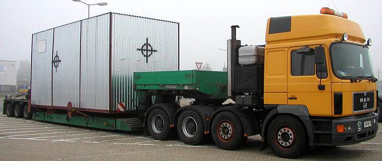 Zwei dieser Allrad-MAN-Zugmaschinen mit Doppelwinden und überbreiten Aufliegern gingen über Bremerhaven nach Doha / Qartar.
