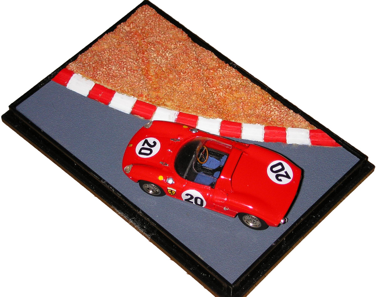 Auf einem Vitrinensockel im Anschnitt einer Rennstrecke, setzte ich den roten Boliden als Minidiorama in Szene.