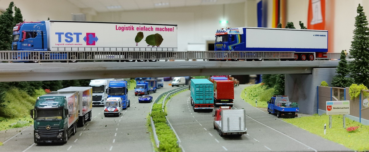 Am Rande unseres ersten Treffens konnten sich die Modellbauer auf einem großen Autobahndiorama kreativ austoben. Immer wieder wurden die Fahrzeuge variiert und eifrig abgelichtet.