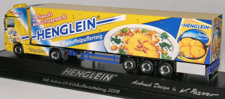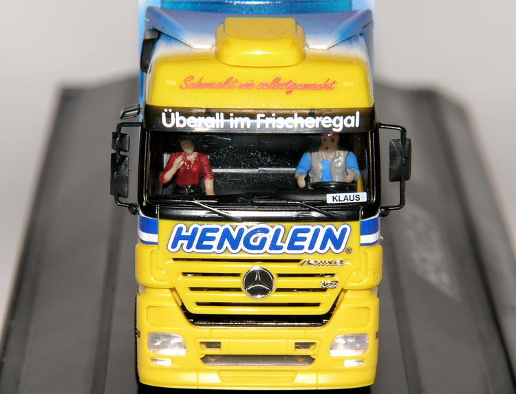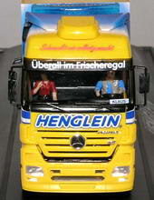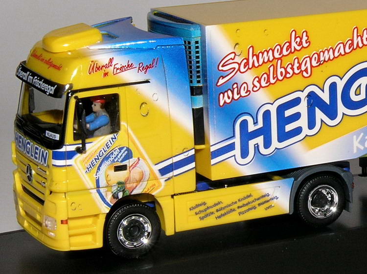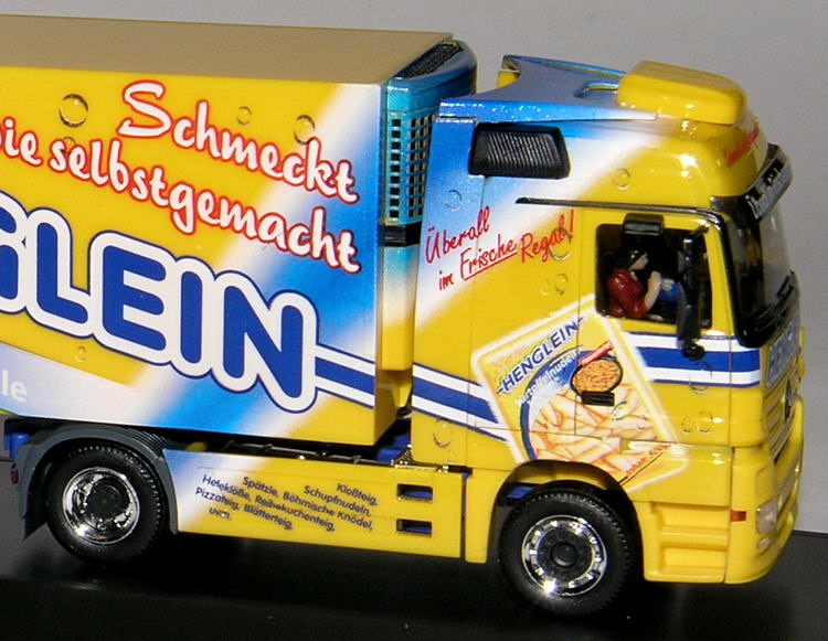 Im blau-gelben Firmendesign präsentiert sich der Actros MP2 aus dem Henglein-Fuhrpark.