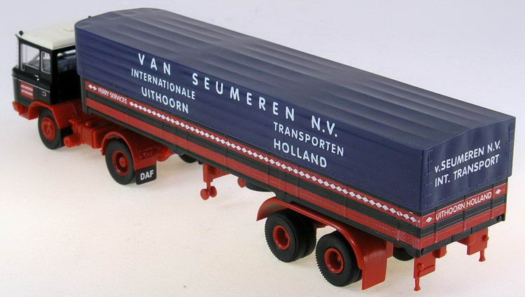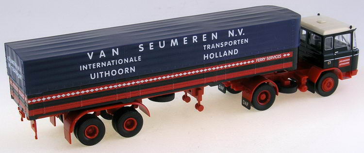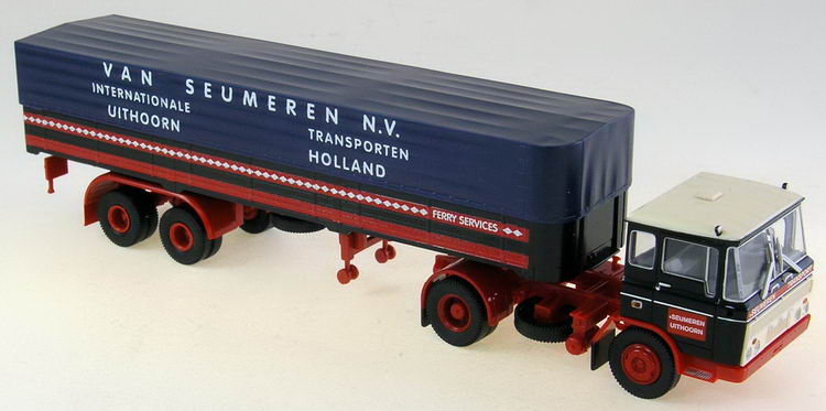 Es handelt sich dabei um einen DAF FT 2600 von 1962 mit einem zweiachsigen Planauflieger.