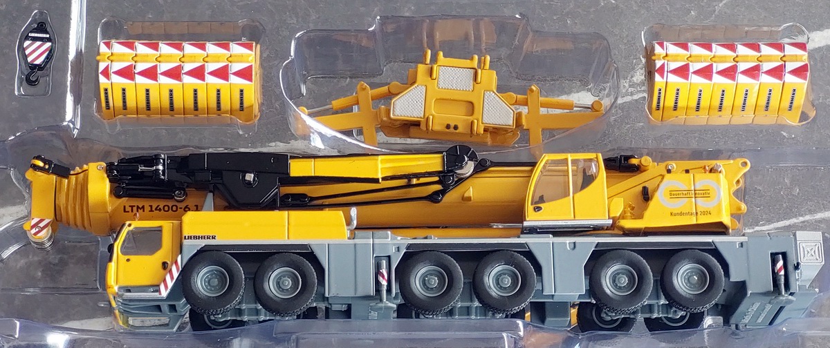 Die Hauptwinde führt das Tragseil und wird mit dem Schlüssel über den Vierkantstift bedient, der auf der Fahrerseite herausragt. Der neue Slogan prangt am Ende des Oberwagens und weist die Neuheit als rares Sondermodell der Kundentage 2024 aus.