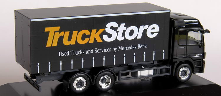 Die Ausstattung des Modells ist sehr gut. Ein dezentes Dekor, silbern aufgedruckte Planenverschlüsse und die Webadresse auf der Kabinenfront werten das Modell auf. Das große Spiegelpaket gehört inzwischen zum Serienumfang des Actros MP3.