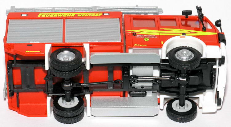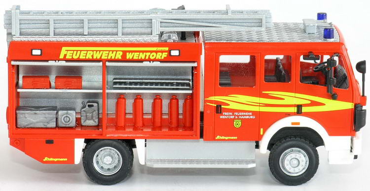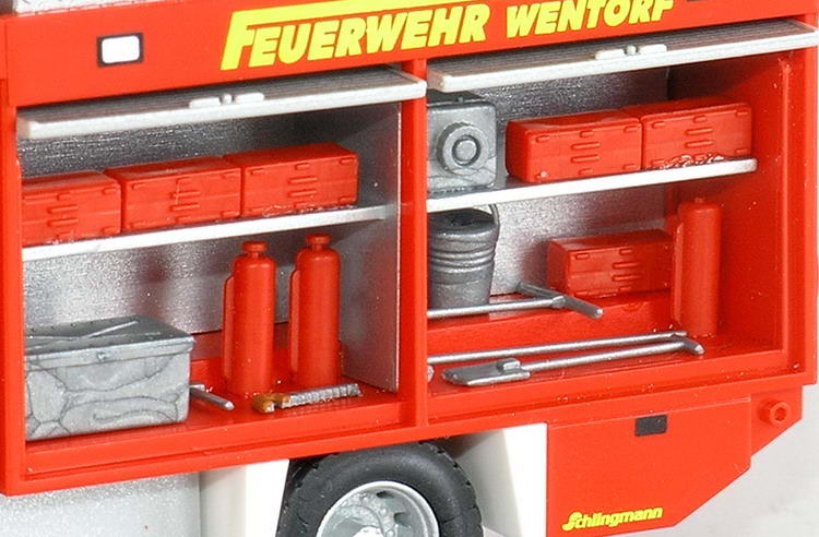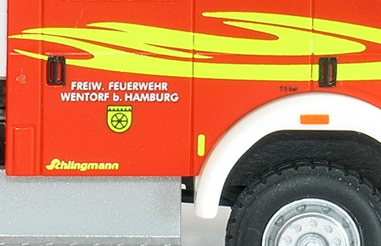 Eine Nahaufnahme der Beifahrerseite: Beschriftung und das Wentorfer Stadtwappen sind lupenrein zu lesen, besonders gut haben mir die schwarzen Türgriffe mit den roten Mulden gefallen, da dies die ausgeprägte Form besonders betont. Der bekannte 7,5 bar-Hinweis der Vorderachse ist mir von keinem anderen Serienmodell bekannt.