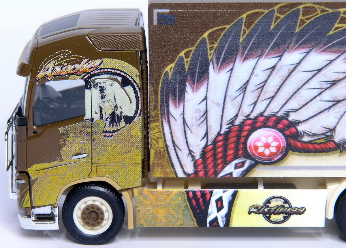Braune Naturtöne und helles Beige dominieren den mächtigen Volvo. Der Motorwagen wird vom Federschmuck der Apache-Häuptlinge bestimmt.
