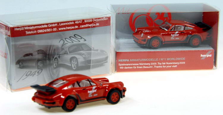 Wie der BMW M1 von der Int. Spielwarenmesse 2007 so ist auch dieser Porsche auf roten Felgen unterwegs. Eine Rarität, da die meisten Messemodelle von Herpa mit Alu- oder Chromfelgen ausgestattet werden.