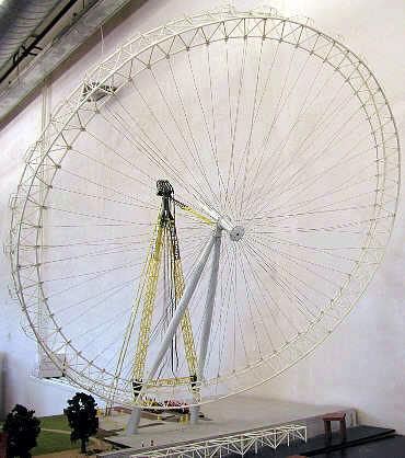 Die Aufrichtung des "London Eye", dem größten Riesenrad der Welt, welches zum Jahr- tausendwechsel direkt an der Themse (die dunkle Fläche rechts mit den Pontons) aufgebaut wurde, ist das neue Thema von Jan Dorst.