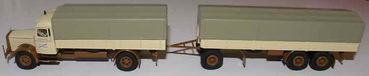 Mercedes Benz O 10.000 "VEB Kraftverkehr Leipzig" mit neuer Front, (Art.-Nr. 59402) und Personenanhänger, (Art.-Nr. 55911).