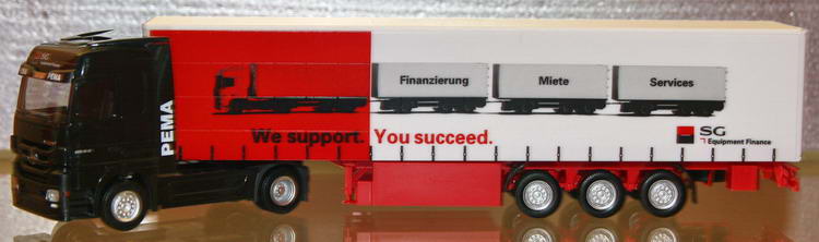 Es folgt eine Übersicht der Werbemodelle, die von Herpa für verschiedene Firmen gefertigt wurden: Actros mit Gardinenplanenauflieger PEMA / SG.