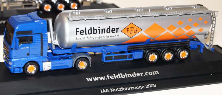Im Gegensatz zum EMPL-Werbemodell verfügt das Messemodell von Herpa über den großen Aufdruck Bison 200 und die neue Actros MP3-Kabine.