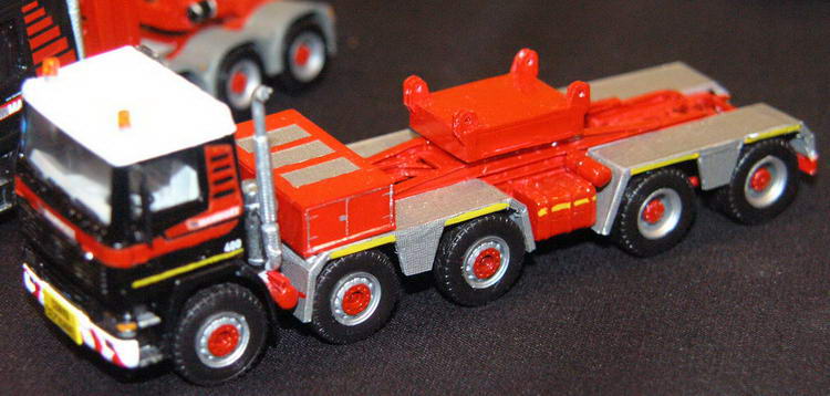 Der Scheuerle-Anhänger aus Interkombi-Modulen entstand komplett im Eigenbau und strotzt nur so vor Details wie den vielen Hydraulikleitungen und dem Hilfsaggregat.