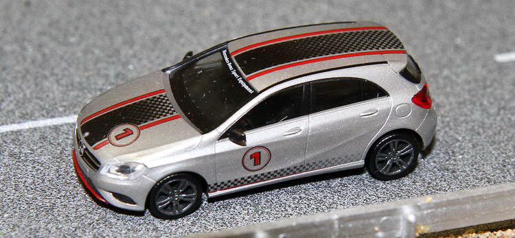 Darauf tummelt sich unter anderem das Messemodell. Die A-Klasse von Mercedes Benz erscheint im "Mercedes-Benz Sport" Racing-Design, vorbildgerecht mit rot abgesetzter Frontschürze. Zusätzlich verfügt der agile Flitzer über schwarze Außenspiegel und mattschwarz lackierte Felgen.