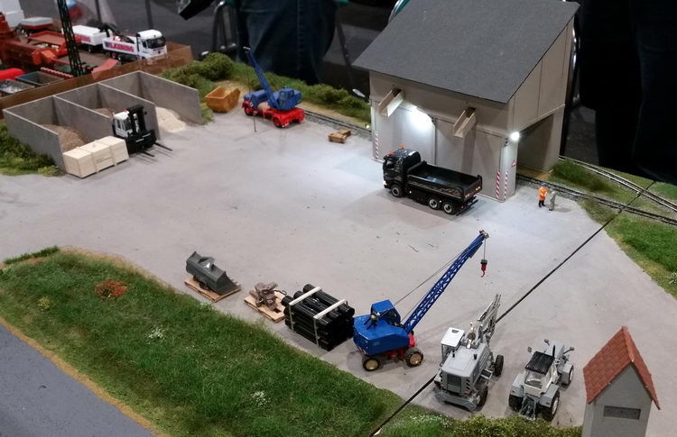 Auf dem Parkplatz warten die Fahrzeuge auf den nächsten Einsatz. Zu dem offenen Scania existiert ein Vorbild. Hier war die Kunst, die Technik unterhalb der Kabine verschwinden zu lassen.
