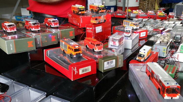 Feuerwehrfahrzeuge bieten mit ihren Blitzern und Blaulichtern sehr viel Entfaltungsmög- lichkeiten. Diese Modelle waren bereits fertig verkabelt und für den Anschluss auf der heimischen Anlage vorgesehen.