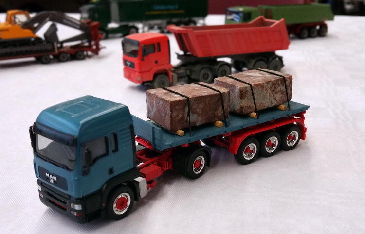 Die langen Bauzeiten führen gelegentlich dazu, dass auch unfertige Projekte bereits gezeigt werden.So wie bei diesem Liebherr Raupenkran und dem flachen Volvo FH mit schwerem Ladekran.