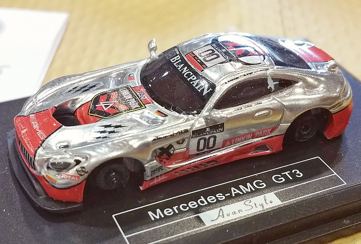 Der Mercedes-AMG GT3 wurde mit Chromfarbe veredelt und mit entsprechenden Nassschiebern dem Vorbild nachempfunden. Fehlende Spoiler und Bereifung lassen darauf schließen, dass die Messe für dieses Projekt einige Tage zu früh stattfand.