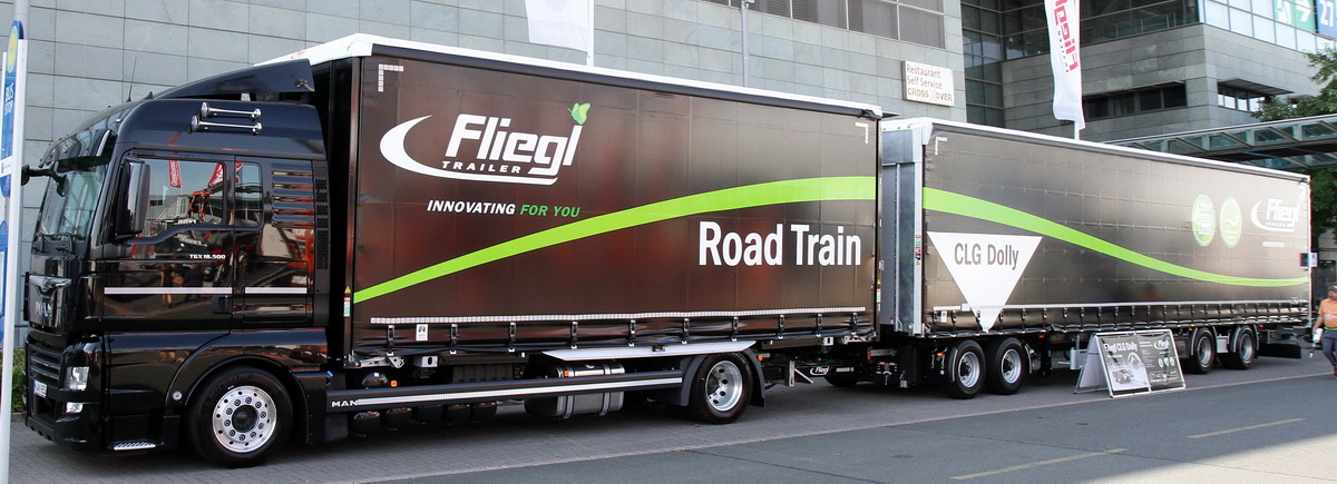 Vor der Halle 27 wartete ein sechsachsiger Gigaliner von Fliegl auf die Besucher. Eine imposante und schwarz-elegant Erscheinung. Markant ist der lange Radstand der letzten beiden Achsen. Das erinnert beinahe an skandinavische Fahrzeuge.
