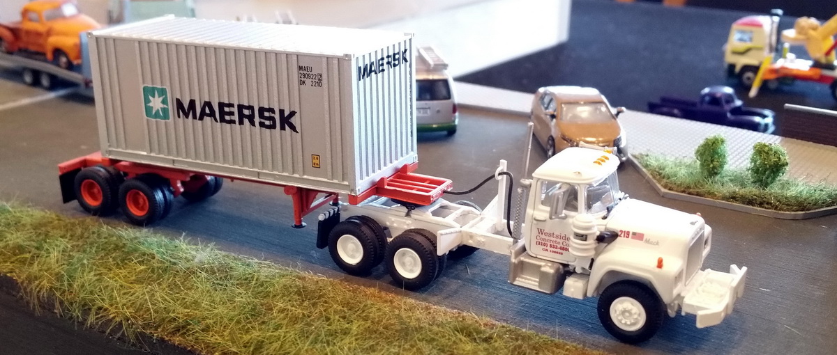 Unser Vereinsmodell, ein Volvo FH mit Semiauflieger, transportiert eine Raumzelle.