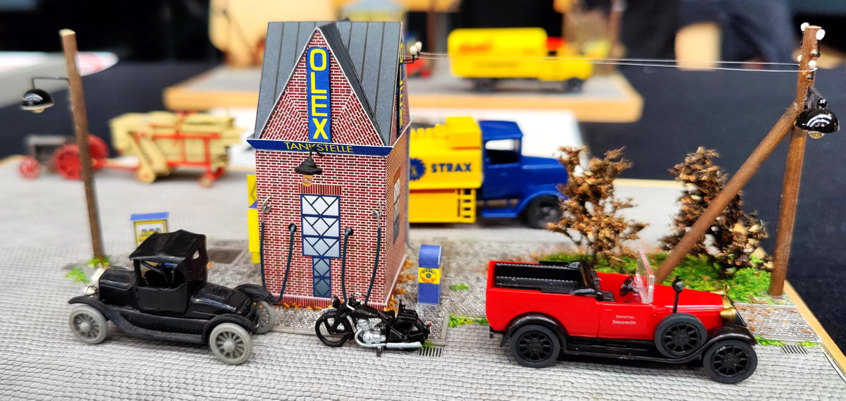 Beinahe vergessene Fahrzeuge von Roskopf kombinierte Hans-Jürgen Schütt mit seinen Papiergebäuden der 1920er Jahre zu reizvollen Dioramen.