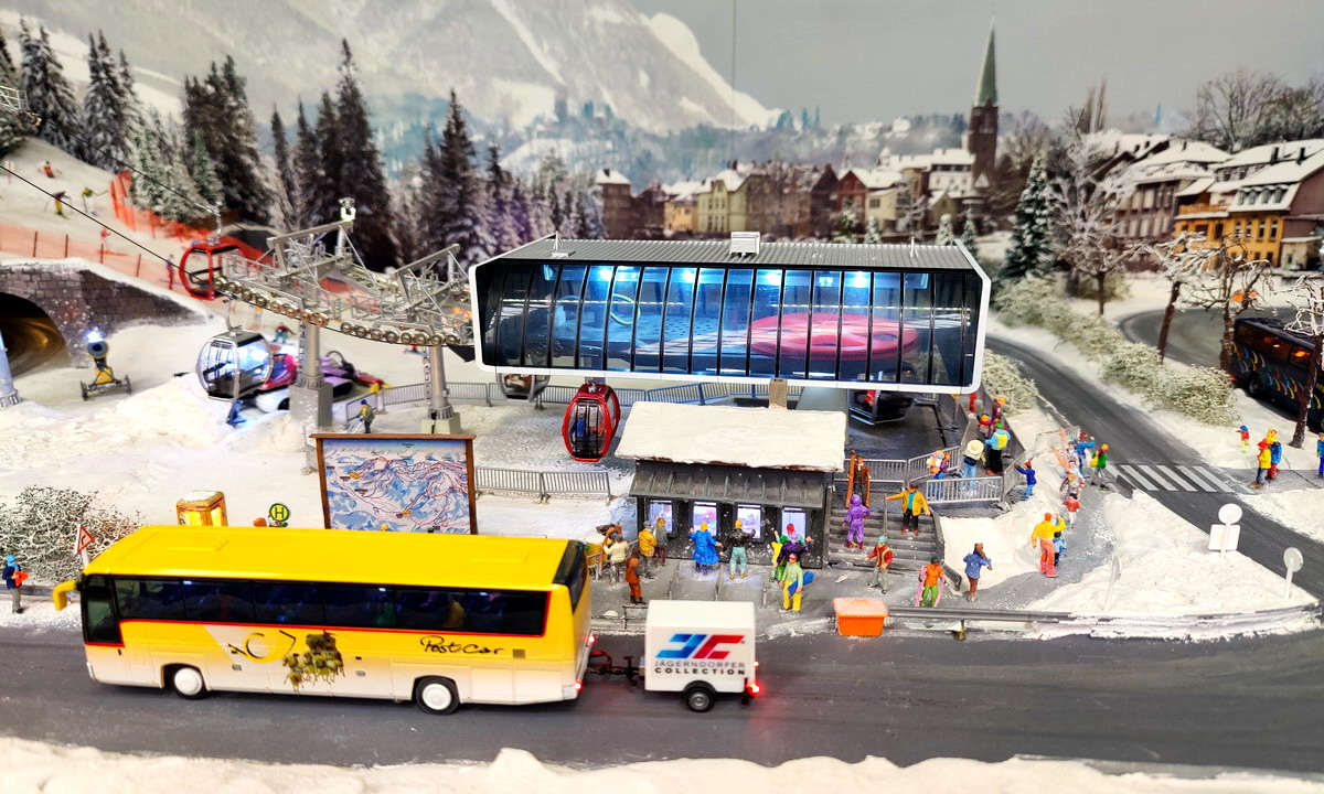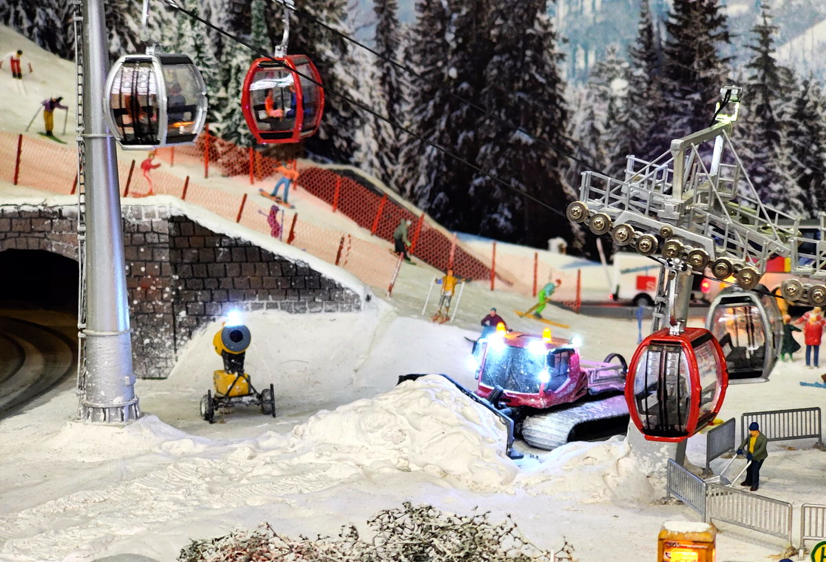 Die Seilbahn stammt von Jägerndorfer. Ein Anbieter, der wahrscheinlich nicht jedem selbsternannten H0-Profi geläufig ist. Um den sicheren Lauf der Seile für diese mobile Messeanlage mit ihren häufigen Auf- und Abbauten sicherzustellen, wurden viele Komponenten wie z. B. die Rollen weiter verbessert oder andere Teile gänzlich ersetzt.