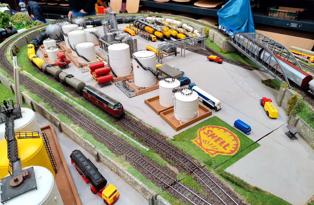 Am anderen Ende der Anlage schließt die Gleiswende eine große Raffinerie ein. Auf dem Werksgleis warten die Tankkessel auf die Befüllung.