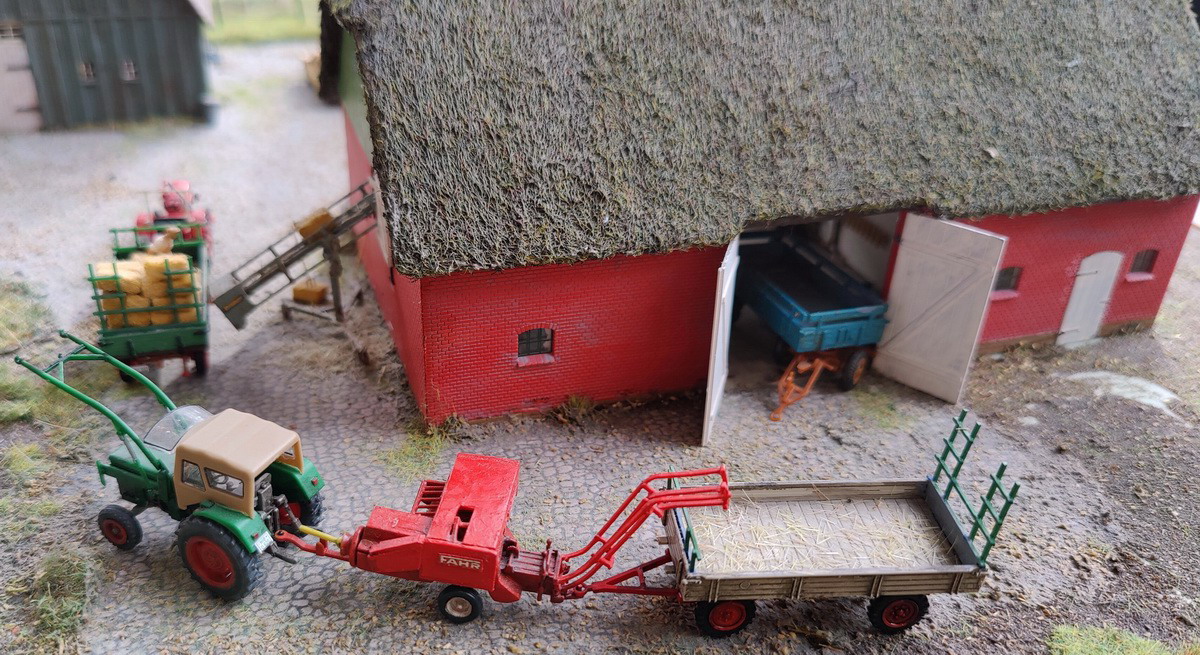 Die (für heutige Maßstäbe) "winzigen Heuballen" gelangten über ein kleines Förderband und mit viel Handarbeit auf den Heuboden im reetgedeckten Stall/Maschinenschuppen gelagert wurden.
