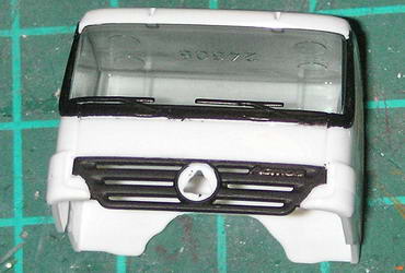 Oben: Der Kühlergrill des Vorbilds ist mattschwarz. Folglich paßte ich die Kabinenfront farblich an.