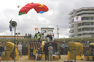 Während sich die ersten Traber und Galopper bereits im Watt warm laufen, landen am Strand die Fallschirmspringer der Fallschirmsportgruppe Ganderkesee.